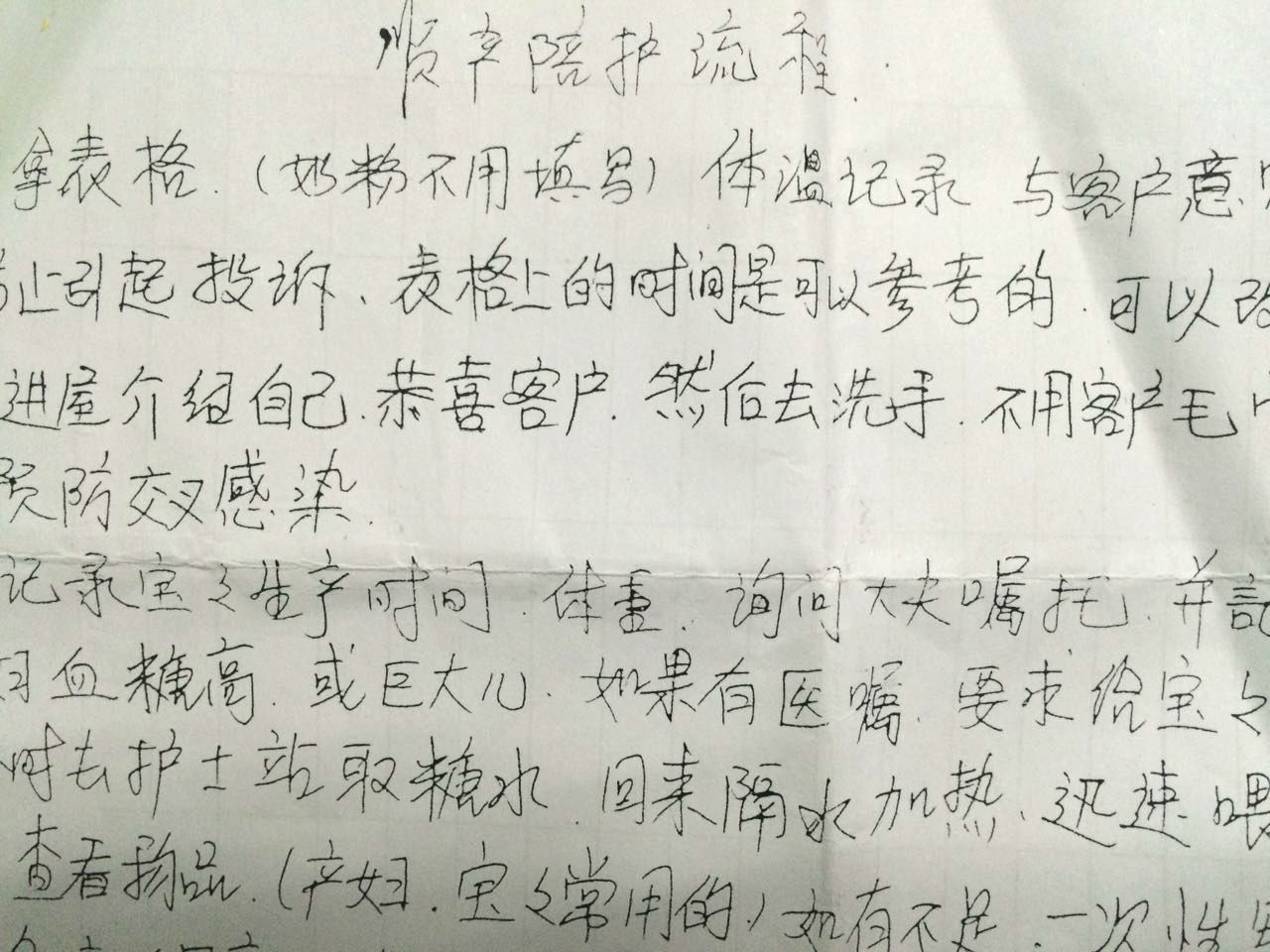 这里的月嫂每天费用是350元,24小时陪护,主要负责婴儿吃喝拉撒和产妇的擦洗等。我还看过一眼她们的培训笔记,上面有“顺产陪护流程”、“新生儿洗澡用品”等内容。所有月嫂身着工作服,很职业的样子。当然,她们拿到手的不会有350元,她们还隶属于劳务公司。
