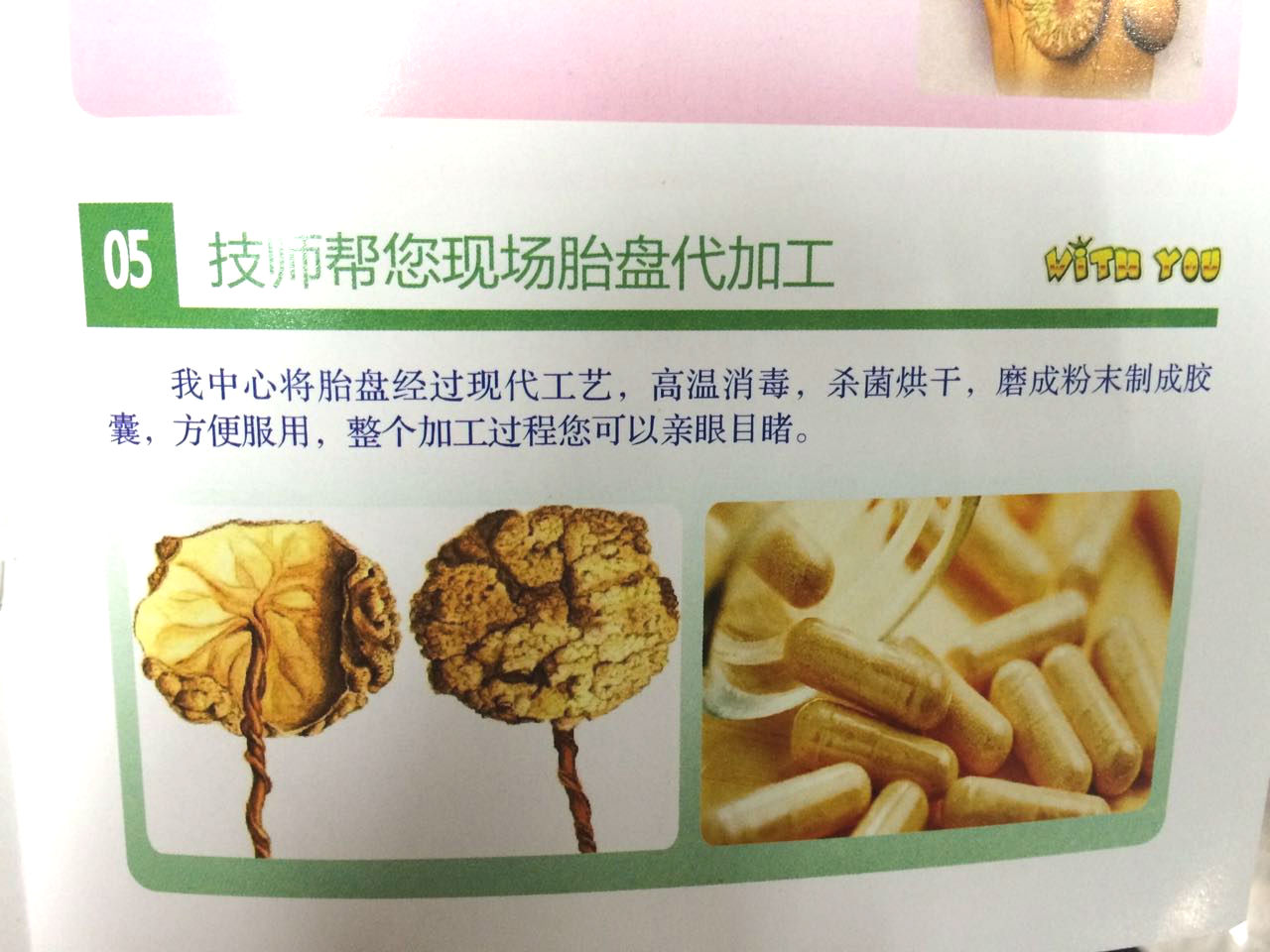 我们在产前检查的时候,产科诊室门口就摆放了胎盘加工的广告,说是高温消毒、杀菌烘干,制作成胶囊。胶囊制作需要在市区进行,每个胎盘收费400元。