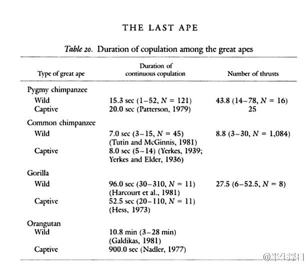动物行为学家和演化生物学家,在观察我们的近亲物种时,发现平均来说,人类的近亲物种性交时间明显比人类短,只有红毛猩猩是显著的例外。那么,问题自然是,这有何益处?