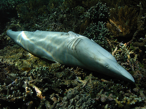 被割掉鱼鳍的鲨鱼沉入海底等待死亡