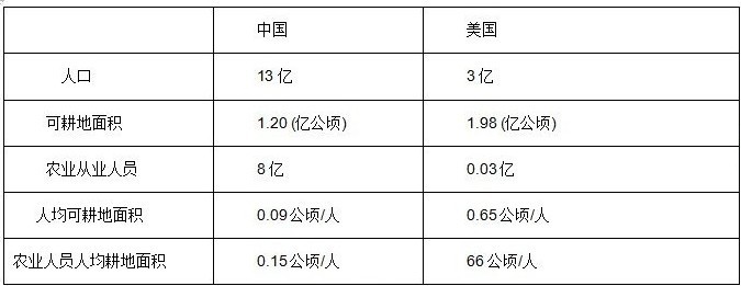 我国粮油资源紧缺还与耕地面积的持续减少有关,国土部网站可以了解,全国耕地面积由1996年10月底的19.51亿亩,减少为2004年10月底的18.37亿亩, 2007年全国耕地面积为18.26亿亩,2011年,全国耕地保有量保持在18.24亿亩,有专家表示,国家“十二五”期末18.18亿亩耕地保有量目标有望落实,其实不乐观的估计,现在耕地面积是否还有18亿亩值得怀疑。全国各个地方的造城运动,毁坏的良田不计其数,以成都平原为例,以前成都市二环路以外都是良田,现在成都平原边缘才能看见成片的良田,成都周边最肥沃的耕地早已被开发区和钢筋混泥土占领、被经济价值更高的花木苗圃包围。良田零零星星成了点缀,由此一斑可见全国。而与美国相比,我国人均的可耕地面积少的可怜,如下表1。