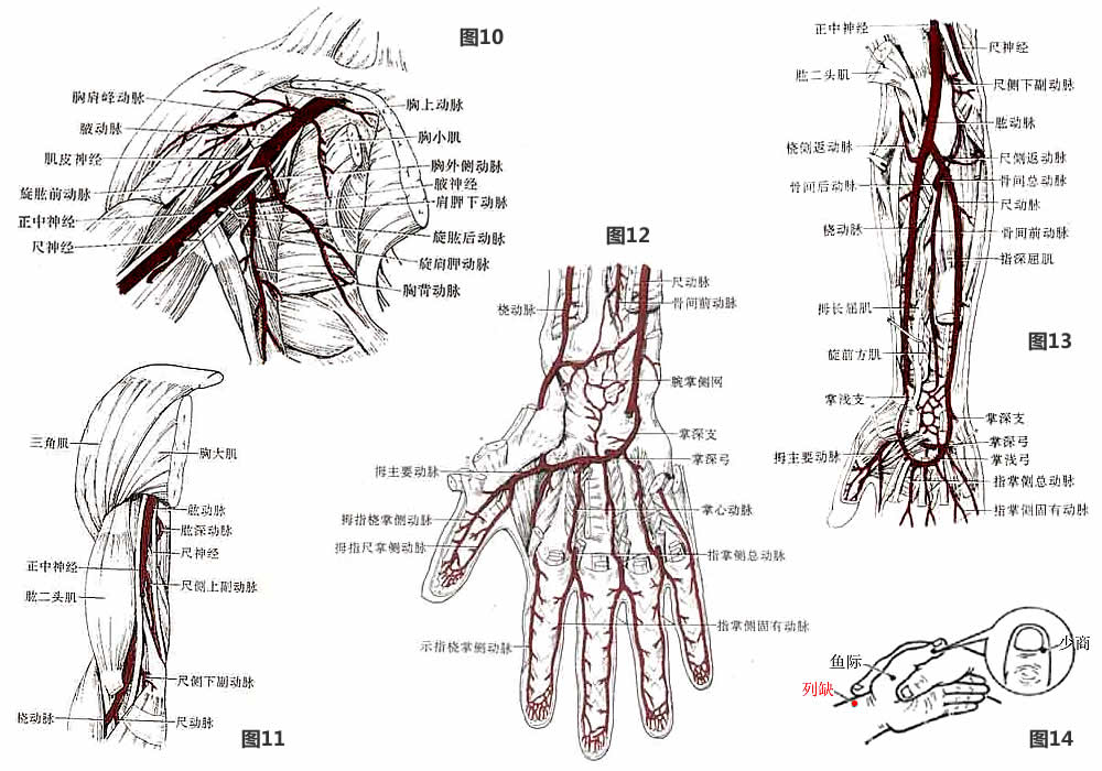 腋动脉往下依次分出肱动脉(图11)、桡动脉(图12)、拇主要动脉(图13),达于拇指末端即是手少阴肺经的末端少商穴(图14),