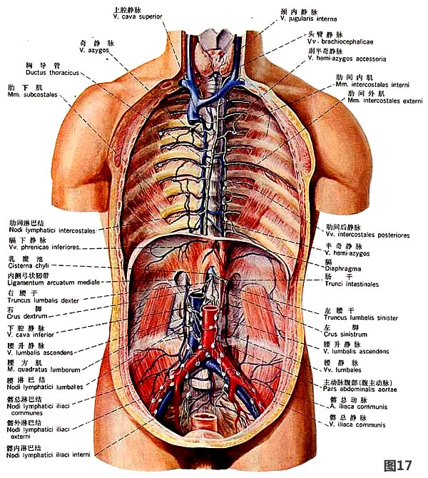 然而,人体解剖学不是以美学和政治学原则来确定的。就像鲁迅先生画血管图,画的虽然美观,奈何人体实际不是这样的。督脉的解剖位置在后正中线紧贴脊柱之前。如图17所示,完全符合其部位的只有胸导管,奈何其长度下不到骶尾,上不到头颈。况且这一结构细而隐蔽,非一般拨弄尸体看看就可以发现的,古人对淋巴系统是一无所知的。直到1652年,瑞典博物学家鲁贝克(Rudbeck,O)发现胸导管及肠淋巴管。那么,旁边勉强可能的就是奇静脉了,但它的位置却不是正中,而是偏右,副奇和半副奇静脉又偏左。且终亦不能达于骶尾会阴部。因此,满足督脉全程线路的解剖结构是不存在的。任脉就更没有影子。腹壁正中线是外科医生经常以刀切开的地方,完全不理会“总任一身之阴经”的任脉,并非是现代外科医生们惯于草菅人命,实在是人体并没有这个东西也么哥。