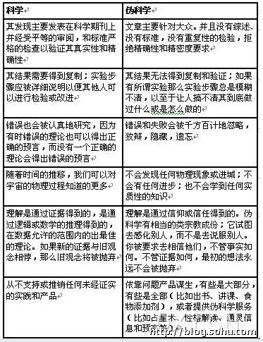 这个表格还可以进一步扩张,因为科学和伪科学是两种观察自然界的截然不同的途径。科学依靠并坚持自我疑问,检验和分析,所以很难被愚弄。而对伪科学而言,他们坚持着古老的,普通的,不合理的和不客观的思维方式,而这种思维方式比科学的思维方式要老好几十万年。而这种思维方式所导致的是迷信和其他奇怪和错误的观点,从伏都教到种族主义,从平面地球到上帝在房顶,撒旦在地下室,人在地板上的宇宙房子,从跳舞求雨到折磨精神病人以躯干其体内的魔鬼,无不是这种思维方式的产物。伪科学鼓励人们相信他们希望相信的。他们使用伪善的言辞去劝说你相信任何的信仰都是一样合理的。而科学开始的时候总是说,让我们忘掉我们所相信的,而通过调查去发现究竟是怎么样的。这两条路没有交叉,因为他们指向的是两个完全不同的方向。