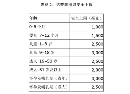 根据表格1里钙的建议摄取量,一些特殊的人群,包括成长期的青少年、孕妇、哺乳期的女性以及老年人每天都需要摄入较多的钙质。但无论性别和年龄,每天摄入1300 毫克足够满足任何人的钙需求量。过量摄入钙营养(多为过量摄取钙补充剂)会对身体造成负面影响,尤其是对于婴幼儿。过量钙摄入会造成血钙过高(hypercalcemia),大量钙离子会囤积于软组织内,造成软组织钙化(calcification)的现象。摄取大量的钙也可能造成便秘,增加钙相关的肾结石风险。表格2列出了各个年龄段可以摄取钙营养的安全上限。