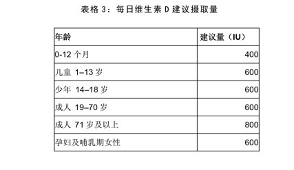 我们可以通过晒太阳由皮肤合成维生素D,但是过量暴露在阳光下会使皮肤老化并增加患皮肤癌的风险;我们也可以从饮食里或者服用补充剂获得足够的维生素D。美国儿科学会建议婴儿从出生后几天到整个青春期每天都要摄取不少于400个国际单位(相当于10微克;对于维生素D,一个国际单位(IU)为0.025微克)的维生素D。表格3是美国国立卫生研究院对不同年龄段维生素D建议日摄取量。儿童维生素D的摄入不足会影响钙营养的吸收,导致骨骼中钙的缺乏,骨密度低,从而容易变形,下肢骨骼受体重影响容易弯曲变形。这就是缺乏维生素D型佝偻病。佝偻病通常还伴有手脚关节变形、鸡胸、驼背或盆骨变形等症状。