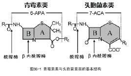 先图解一下,上图左是青霉素基本结构,由A和B两部分组成,“B”部分就是“β-内酰胺”,“A”部分是氢化噻唑环,这个结构很不稳定,容易重排、分解、聚合,当β-内酰胺脱离氢化噻唑环后,就可与特异性IgE结合,诱发“速发型变态反应”;上图右是头孢菌素类药结构,其“B”部分与图左的“B”部分都是“β-内酰胺”,区别是图右的“A”部分是“氢化噻嗪环”,这个组合结构稳定,不易分解、聚合。下图就是半合成青霉素,与PG相比,侧链改变了,结果是令半合成青霉素比PG的结构更稳定了,不易分解,耐酸耐酶。