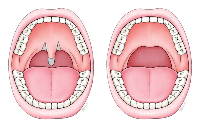 医生用二氧化碳激光器使悬雍垂(喉咙后部悬垂的软组织,俗称小舌头)缩短,并将悬雍垂旁边的软颚切去一点点。等切口愈合,周围组织会变硬。