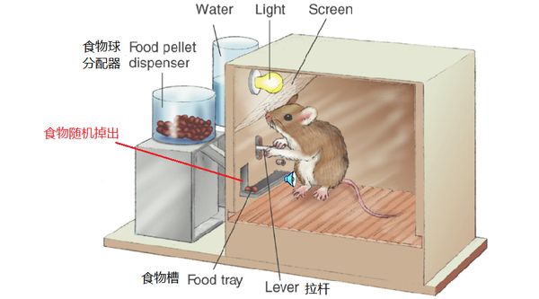 把一只饥饿的老鼠放进“斯金纳箱”,起初它会四处探索,偶尔碰到控制杆,就会得到食物。多次之后,老鼠学会了通过主动拉杆来获取食物。这就是操作性条件反射——在奖励的鼓舞下,老鼠的行为得到了强化。尔后,如果我们不再为拉杆的老鼠投递食物,这种行为就会逐渐消退,直至消失。