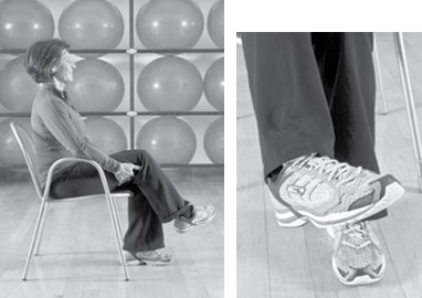 - 把右脚踝放在左膝上面,环绕带从右脚趾正下方转到脚背上,用左手保持其紧绷。慢慢将脚尖勾向右胫骨(3秒),暂停(1秒)后慢慢还原(3秒)。共做10次。