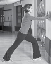 动作:双手放在墙上,向后伸直右腿,向地面按压脚后跟;同时微微弯曲左膝,并保持脚后跟着地。现在尽可能弯曲右膝,脚后跟不要离地,感到右小腿伸直。保持10~30秒后还原。然后换左脚重复,即为完成一组。