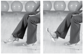 1. 右脚前移,右脚跟与左脚尖齐平。保持脚跟着地的同时,尽量勾起右脚尖(1秒),轻敲地面(1秒),共10次。