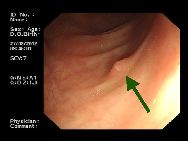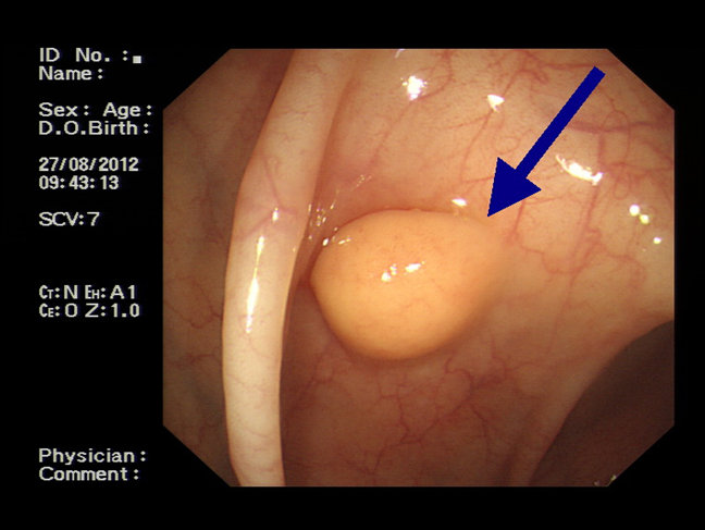 图 大肠壁上悬挂的圆形突起(箭头所指)称为大肠息肉