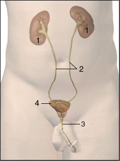 图3 男性排尿系统 1 肾 2 输尿管 3 尿道 4 膀胱