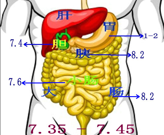 我们说身体的Ph值在7.35到7.45之间,是指血液、淋巴液、脑脊液、心包液、胸腔液、腹腔液、关节液等看得见的液体和看不见的细胞内容物。正常人体为了与大自然交融和生理功能的要求,不同的部位可以有不同的Ph值。比如人的唾液pH值在6.2~7.4之间,胃液ph值在1-2之间,胆汁pH值是7.4,胰液pH值是8.2,小肠液pH值是7.6,大肠液pH值是8.2。这一系列消化液的不同Ph值都是为了一个共同的目的:完全彻底有效地消化吸收食物中的有用成分。强酸性的胃液是为了杀菌和降解食物的分子结构。肠道的碱性有助于消化吸收。