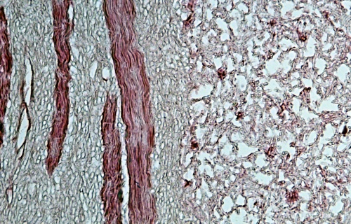 图2 红色是虫体的肌肉(平滑肌),浅蓝色竹节样细丝是霉菌菌丝