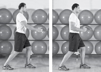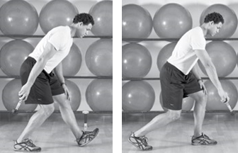 动作:先用右手握住哑铃,右腿向后伸直,压住右边的脚后跟至地面,左膝稍微弯曲。身体慢慢地前后来回摆动,手臂和哑铃轻轻地像钟摆一样摆动。完成10次后切换位置,换左手握哑铃重复10次,即为完成一组。