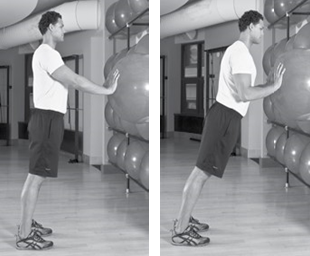 起始位置:面朝墙壁,笔直站立;把稳定球靠在墙上,与肩同高;伸直手臂,与胸部同高;手掌按住球,指尖指向天花板。