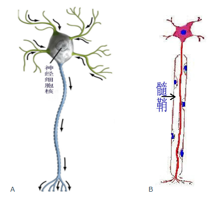 图2 A 一个神经细胞示意图 B 中央红色为神经细丝及包绕的髓鞘