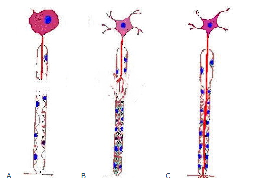 在科学实验研究中发现,一个神经纤维断了后,只要能把包绕神经丝的的外套(髓鞘)对好位置,没有错开,那么,中央的神经细丝就可以顺着对上位的髓鞘外套伸进原本断了的远端髓鞘中,最终形成新的神经纤维,而且恢复神经传导信号的功能(图3)。