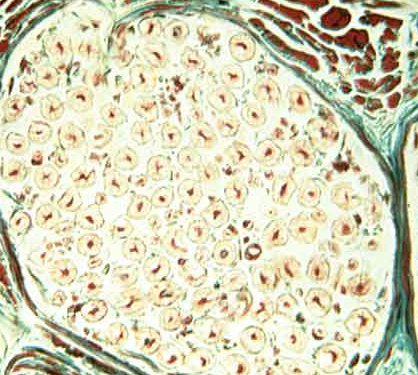 图5 A 人的眼睛看到的一条神经中有几条神经组成 B 一根神经中有无数根神经细丝组成